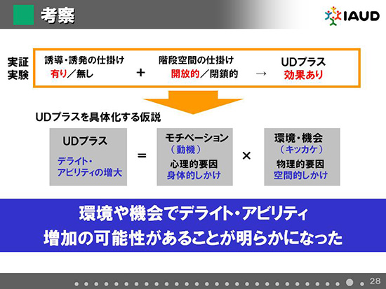 今回の実証実験では行動を誘発する仕掛けがある場合、そして開放的な空間といった組み合わせで私達の考えるUDプラス的な効果があるということが実証できました。これにより、冒頭でも述べた、モチベーションに環境・機会をかけあわせることでUDプラス的な効用が得られるということ、すなわちデライトや活動量が増加することが、アビリティの増加をもたらす可能性があるという、私達の仮説が明らかになったと考えています。